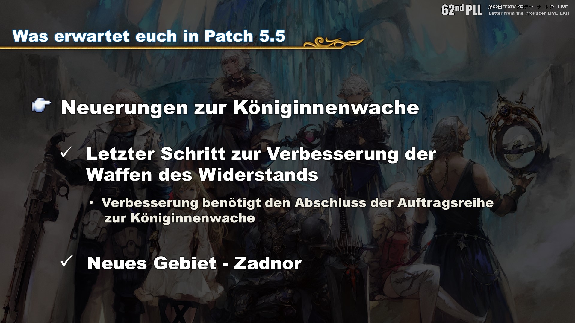 Wie jedoch bereits erwähnt ist das Absolvieren der Aufträge zur Königinnenwache nach den Verbesserungsschritten aus Patch 5.35 notwendig, um mit den Schritten, die in Patch 5.45 hinzugefügt wurden, fortzufahren. Die Waffen des Widerstands und die Königinnenwache sind schließlich miteinander verbunden, also empfehlen wir, die Geschichte zu spielen. Es sollte auch erwähnt werden, dass das Absolvieren der Aufträge aus Patch 5.45 notwendig sein wird, um die finalen Verbesserungsschritte in Patch 5.5x zu durchlaufen.