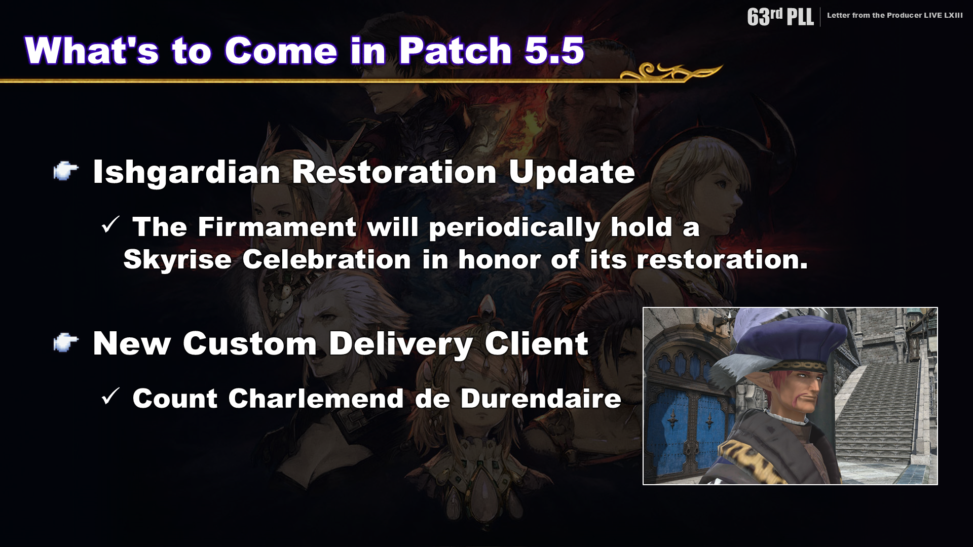 The latest custom delivery client is Count Charlemend de Durendaire. Your impression of him may vary depending on the Ishgard-related side quests you’ve completed. His introduction as a custom delivery client is a culmination of the story of post-Dragonsong War Ishgard we’ve built up through this character.