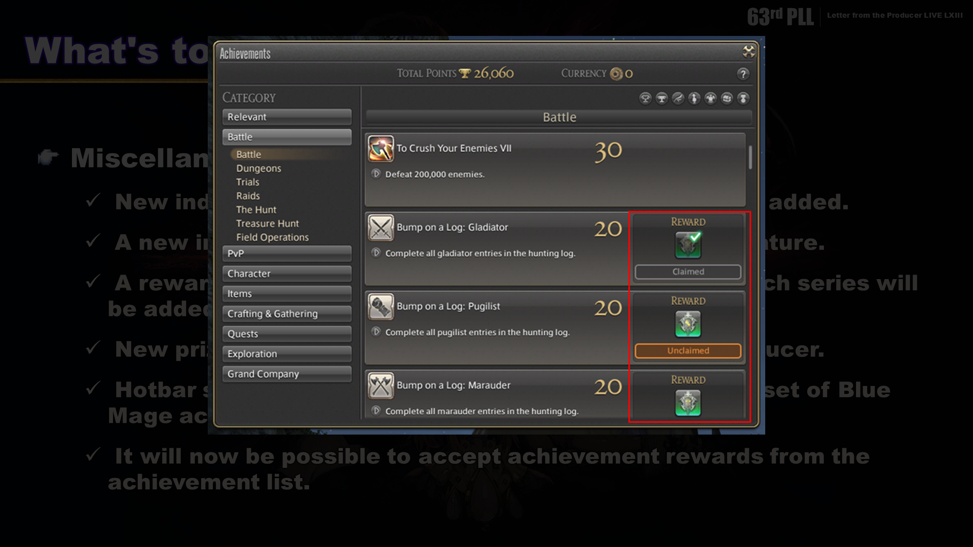Achievement rewards can now be accepted directly from the achievement list. As for achievement certificates, you’ll still be able to exchange them for rewards through Jonathas in Old Gridania.