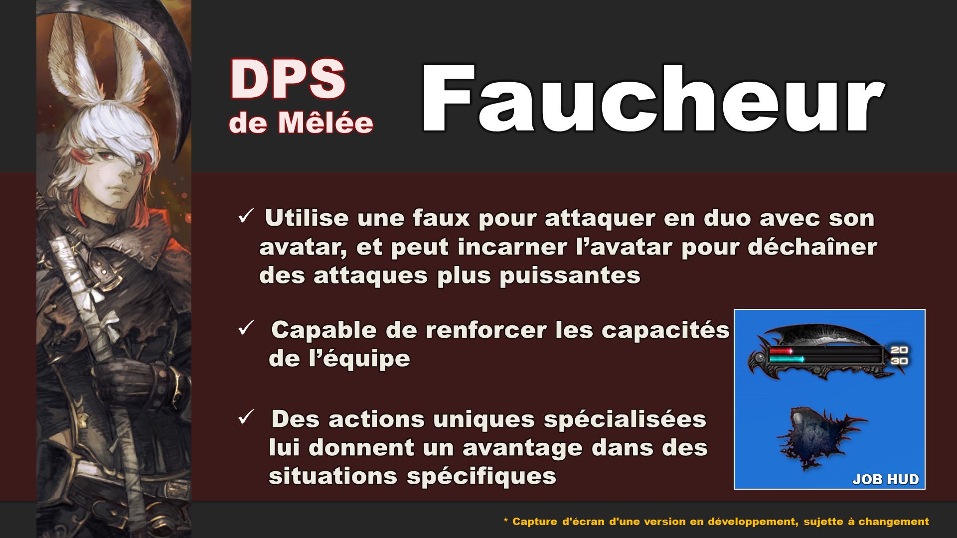 Le faucheur accumule de la jauge des âmes en utilisant des techniques d’arme. Quand la jauge atteint un certain montant, elle peut être consommée pour exécuter des attaques à côté de l’avatar, ce qui génère de la jauge du linceul. Consommer la jauge du linceul permet au faucheur de servir d’hôte à l’avatar et d’utiliser un combo spécial. Ce job aura une capacité renforçant l’équipe mais sera plus proche d’un DPS pur.