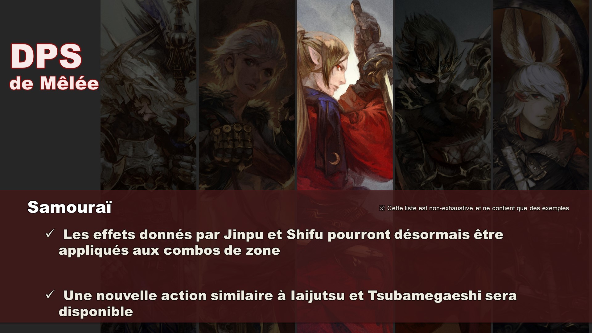 Le samouraï sera ajusté simplement et restera un job de DPS purement de mêlée. La plupart de ses changements seront des nouvelles actions, mais Tsubamegaeshi et Meikyo Shisui deviendront toutes deux des actions à deux charges pour permettre plus de flexibilité au début du combat et lors des différentes situations. De plus, lorsque Meikyo Shisui sera actif, la troisième technique d’arme d’un combo donnera les effets bénéfiques normalement donnés par la troisième technique d’arme.