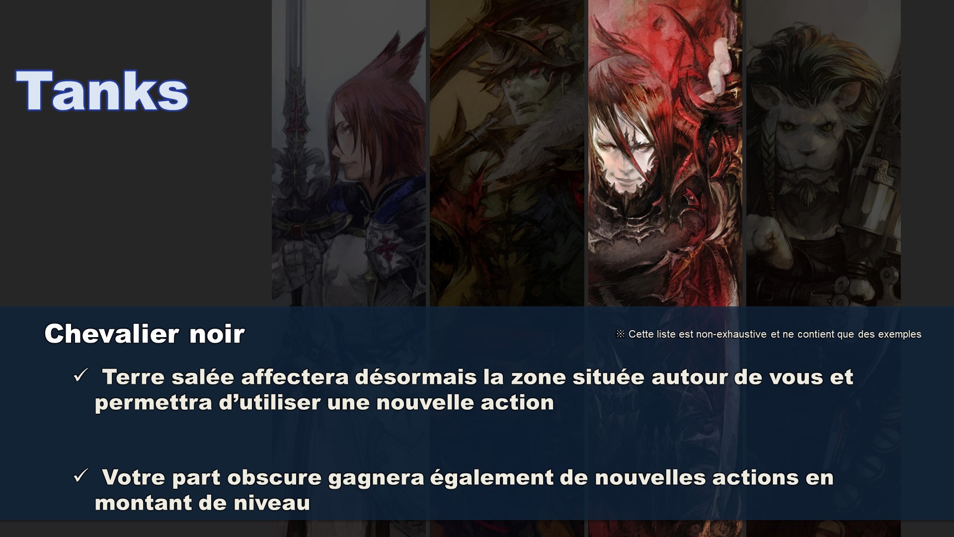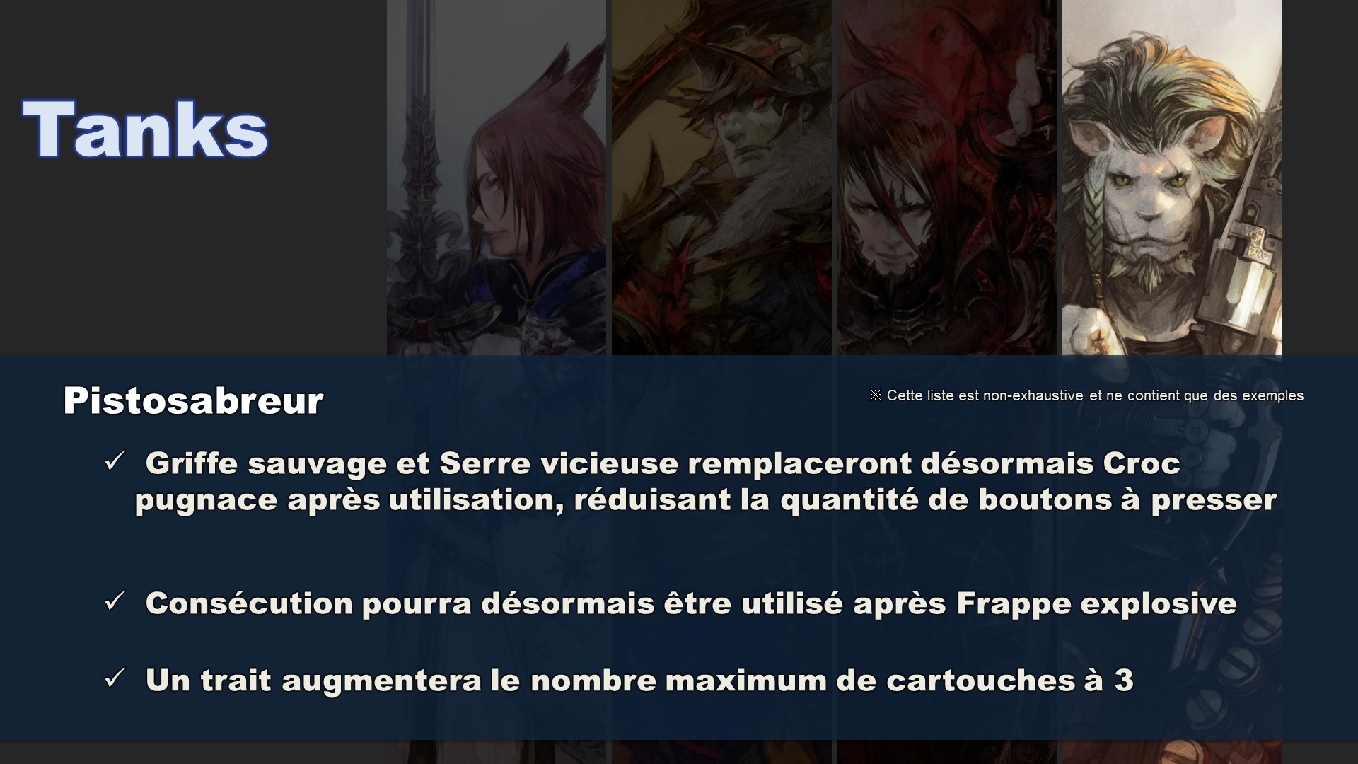 Un ajustement commun à tous les jobs de tank sera l’ajout d’aspects techniques à l’usage de certaines aptitudes défensives. Par exemple, leur utilisation au bon moment (par exemple, juste avant de prendre beaucoup de dégâts) apportera de plus grands bénéfices ou des effets additionnels déclenchés par l’utilisation simultanée de certaines aptitudes.