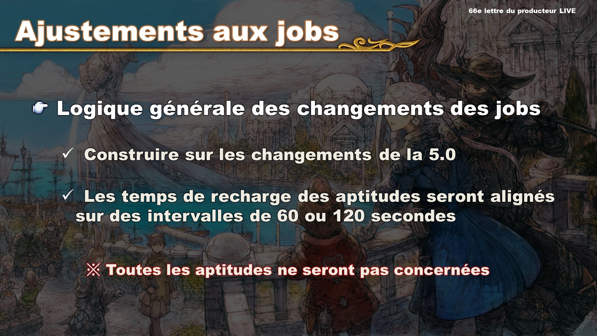 Beaucoup de jobs verront les temps de recharge de leurs aptitudes offensives principales être alignés sur des plages de 60 ou 120 secondes. Cet alignement permettra de mieux coordonner les pics de dégâts dans les instances à difficulté élevée, ainsi que de faciliter l’apprentissage des jobs aux rotations similaires. Néanmoins, notez bien que toutes les aptitudes ne sont pas sujettes à ce changement. Par exemple, le Manalignement du mage noir gardera son temps de recharge de 90 secondes.