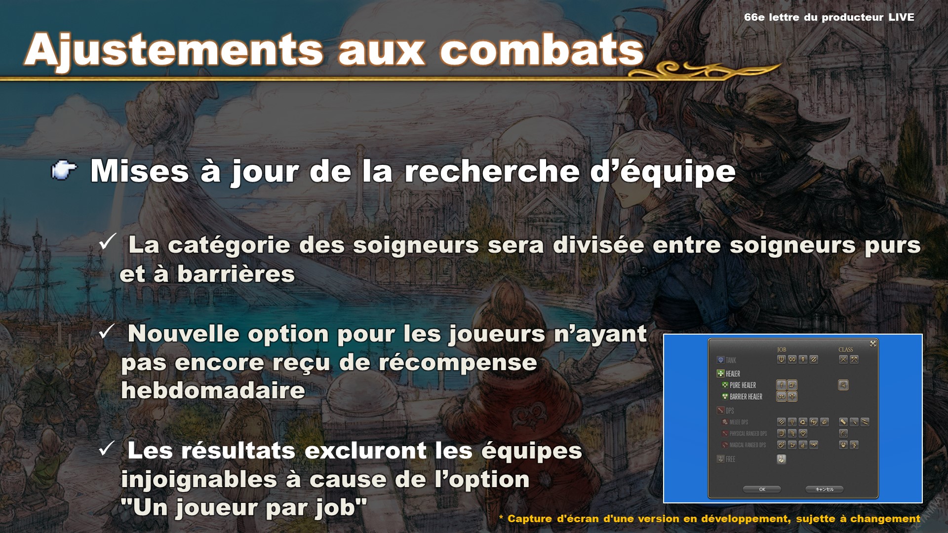 Pendant l’émission, nous avons vu des commentaires parlant de “garde parfaite” ou de “parade” comme dans d’autres jeux, mais ce n’est pas le cas dans un jeu qui suit un modèle client-serveur comme FFXIV. Il s’agit plutôt d’ajouter un effet additionnel rapide après l’usage d’une aptitude défensif, qui serait gâché si celle-ci était utilisé de façon hasardeuse, alors assurez-vous de bien vous renseigner sur les effets additionnels et d’en profiter pleinement.