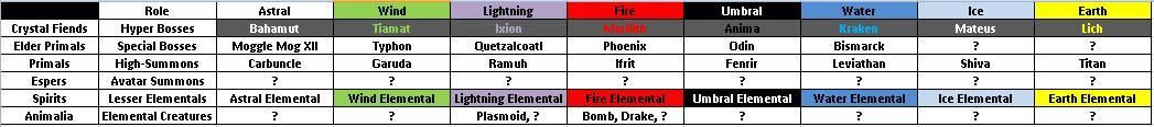 Remember they had been considering Summoner to be the Job crystal for a beastmaster. Which means the possibility of tamed creatures becoming enhanced with elements, or even ascending to the role of Espers (alternate name for avatars). A series of quests to form unions with the spirits could be a fun way of doing this. Moreover, the primal summons would be considered something again only summoners can perform under very rare and special situations, in a ritual called a "High Summon", much like the limit attack of Yuna in FFX.