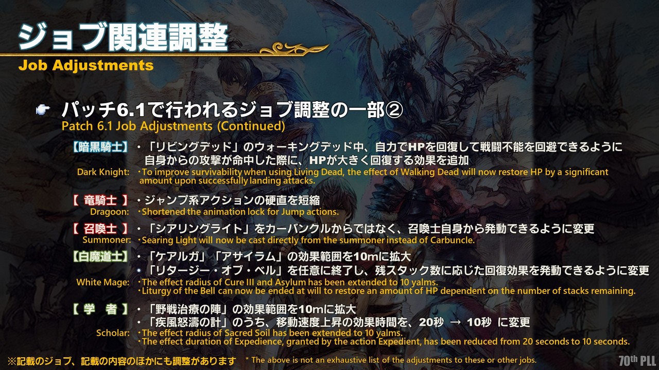 なお、現時点で操作が忙しくやや難易度が高いジョブとされている竜騎士/占星術士に関しては、パッチ6.2を目指して更なる調整を検討しています。ご了承いただければ幸いです。