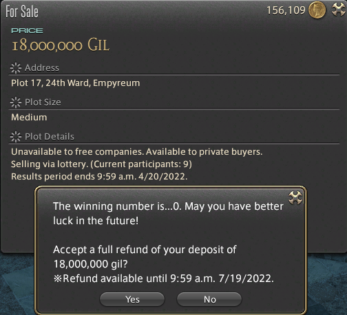 Was the only one who buyed a lotterie ticket on 8th ward plot 18 of Empyreum on Ragnragok, Also lost to no one....