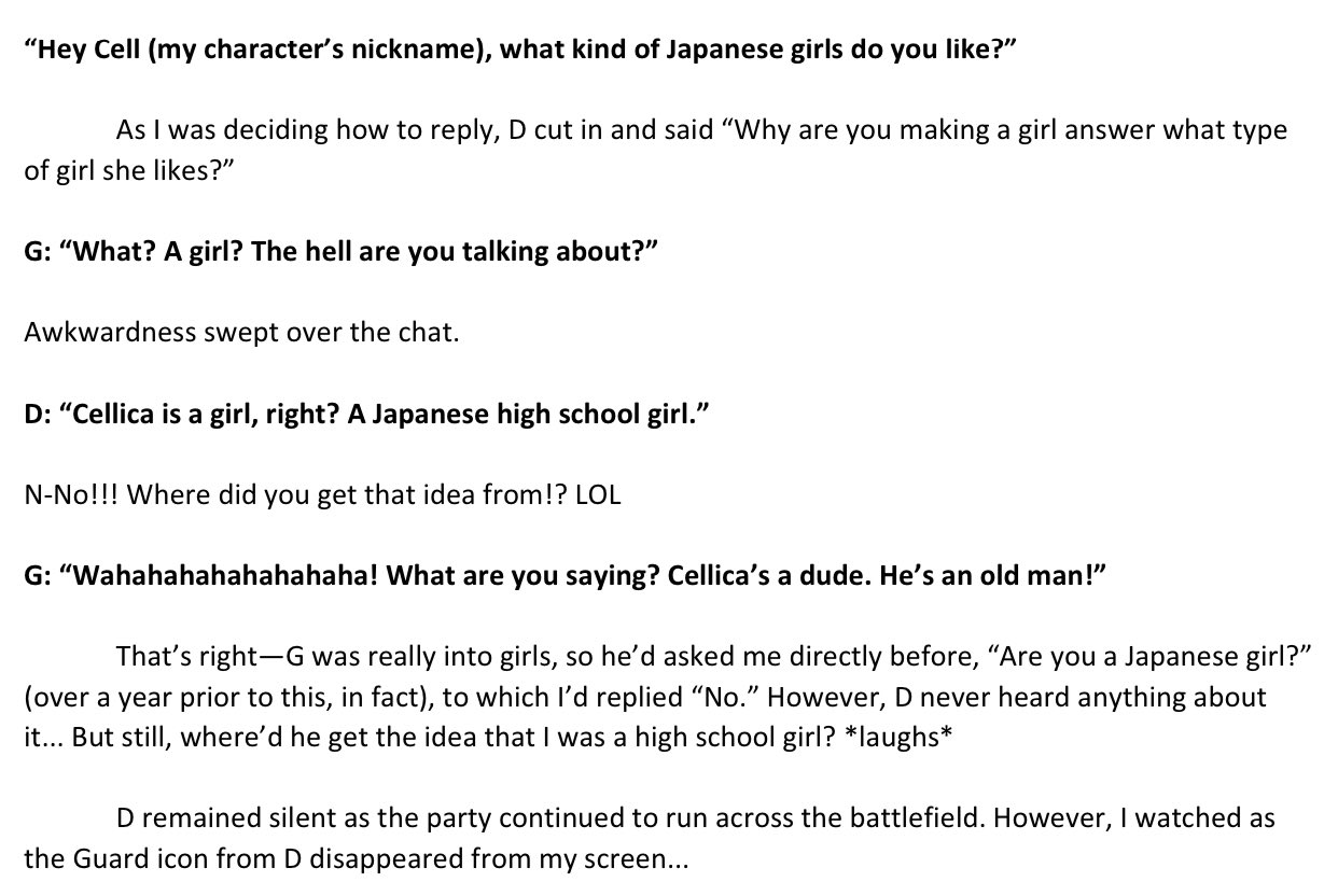He couldn't be any more clearer that he's roleplaying as his character as opposed to openly misleading people regarding his gender identity. It comes down to whether these were mutual understanding of it being Roleplay as opposed to genuine and deliberate misleading. It equally comes down to understanding the difference between IC and OOC.However, I want to emphasize that there's a difference between someone who's obviously pretending to be a girl and someone who's playing as their female character would! The former is unethical in a way, while the latter is a respectable form of roleplay