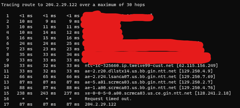 This result is consistent with the results I was getting yesterday. Same locations, same general communication times - except for the 12th hop, at 129.250.5.17. My results yesterday for that hop were consistently 200+, or timing out.Code:6 12 ms 12 ms 12 ms 64.15.5.82 7 11 ms 13 ms 20 ms ae88.edge2.NewYork6.Level3.net [4.30.181.89] 8 13 ms 20 ms 17 ms NTT-level3-NewYorkCity6.Level3.net [4.68.75.78] 9 14 ms 12 ms 14 ms ae-12.r21.nwrknj03.us.bb.gin.ntt.net [129.250.3.129] 10 34 ms 40 ms 35 ms ae-3.r22.chcgil09.us.bb.gin.ntt.net [129.250.2.166] 11 41 ms 40 ms 37 ms ae-1.r23.chcgil09.us.bb.gin.ntt.net [129.250.2.27] 12 78 ms 82 ms 80 ms ae-1.r24.snjsca04.us.bb.gin.ntt.net [129.250.5.17] 13 92 ms 88 ms 85 ms ae-4.a00.scrmca03.us.bb.gin.ntt.net [129.250.7.57] 14 86 ms 85 ms 82 ms xe-0-0-5-0.a00.scrmca03.us.ce.gin.ntt.net [128.241.2.18] 15 * 81 ms * 204.2.29.241 16 83 ms 84 ms 83 ms 204.2.29.6