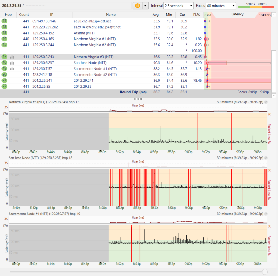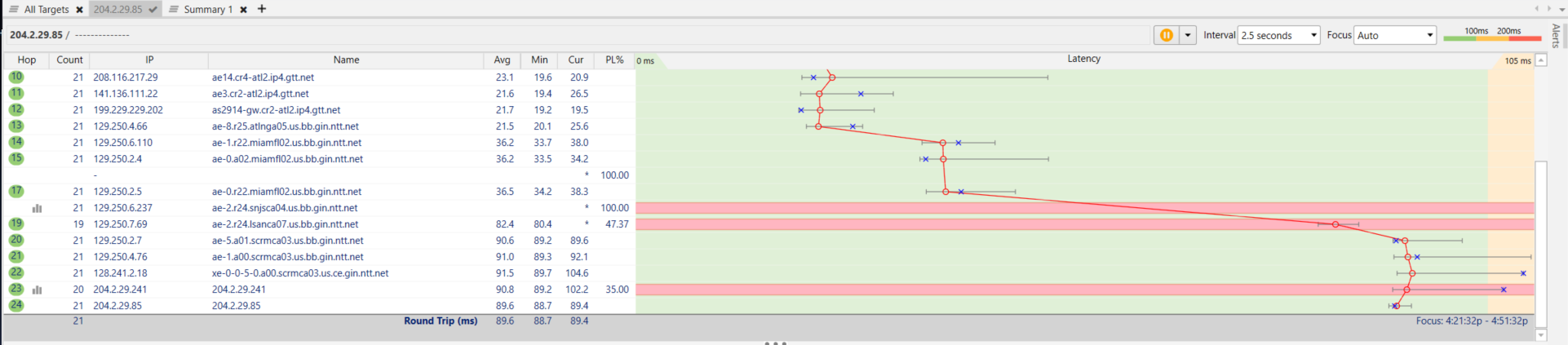 As you can see the ping times started to go up at about 12:30pm EST. The packet loss starts at 2pm EST. My VPN is stable so good thing I still have that.
