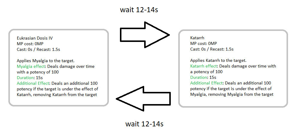 Hmm, if SE's engine worked better, and we had something like WOW (haste stat increases speed of DOT ticks, they don't have to be bound to strict server tick cycle, etc), you could have Katarrh as 'increases the speed at which Myalgia deals damage by 50%, for 10 seconds' or such, to make it an upkeep buff you want to alternate with Dosis occasionally. Instead we'd have to use a workaround like 'Katarrh applies Katarrh to enemy' and 'If enemy has Katarrh, Myalgia's damage is increased by X% upon application', which is, lets be frank, way more boring. I dunno I think people will find the timing aspect to be super annoying more than fun, due to how fight mechanic/heal-pump-moment timings line up. We can already see people getting annoyed by how SE keeps making ASTs do their cards during a complex mechanic because 'we have to challenge the players during their 2min burst to test their skill' or whatever