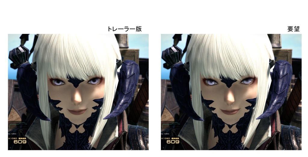 キャラクリ画面だと光源がいまいち、という意見もあったため、ベンチマーク内の動画から比較をさせて頂きました。