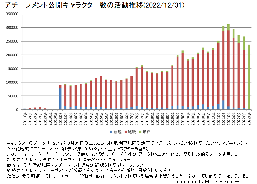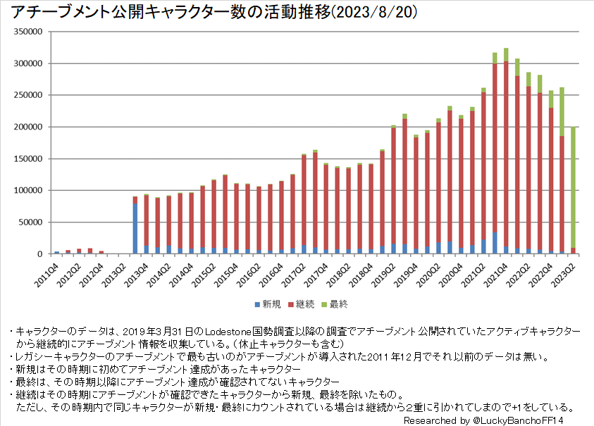 I hope you noticed that every single bar moved upwards from ShB and early EW.I looked up the previous chart made in 2022 and it shows lower participation numbers for the last column (2022Q4) compared to the same time period (2022Q4) in the most recent chart (2023). This means the last column in the most recent chart (2023Q2) is likely underreporting the number of active players. Additionally, look at the number of green (final/quit) characters in the old chart in column 2022Q3. The number of green characters decreases by half for the same quartile (2022Q3) in the newer chart.