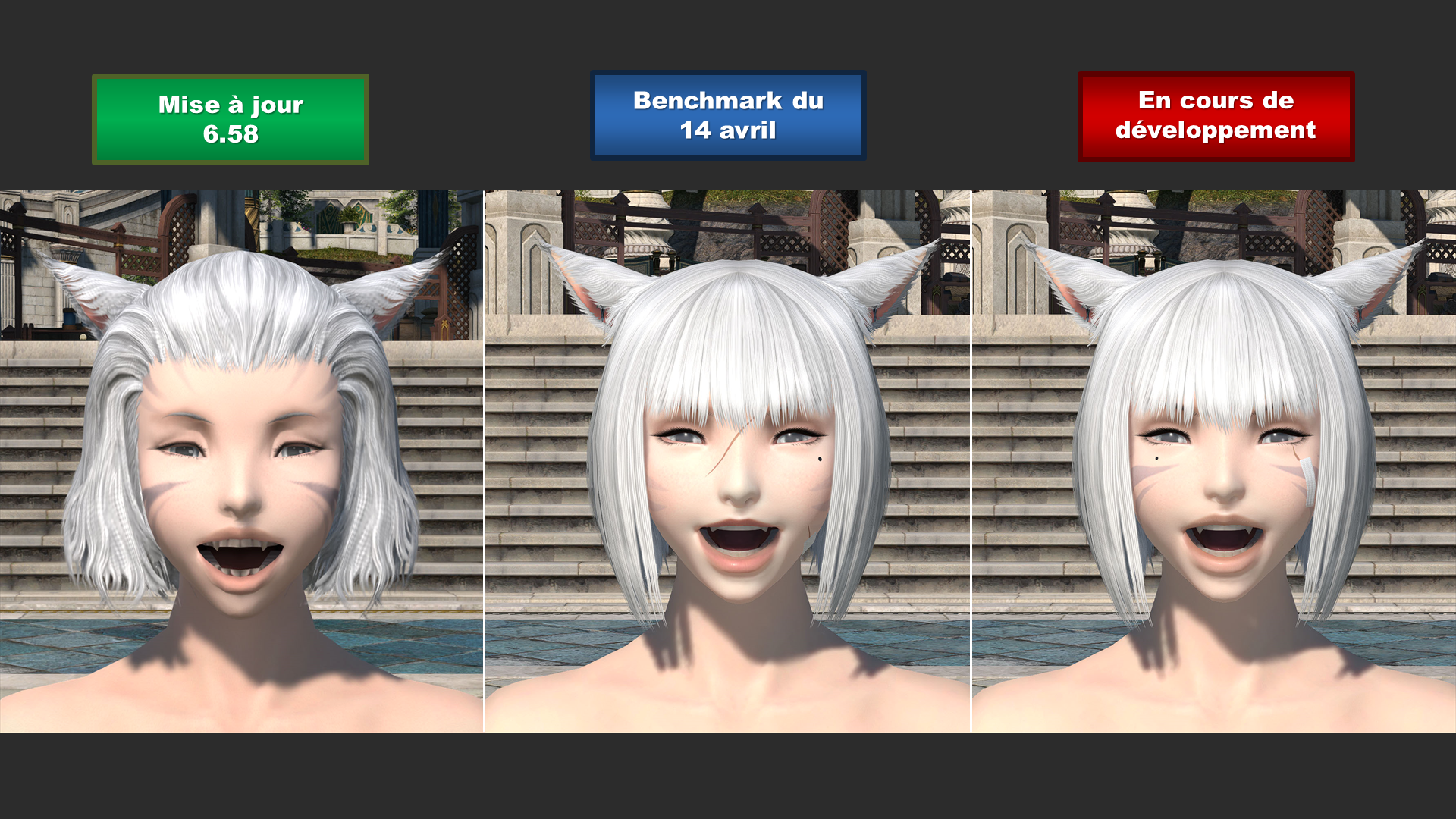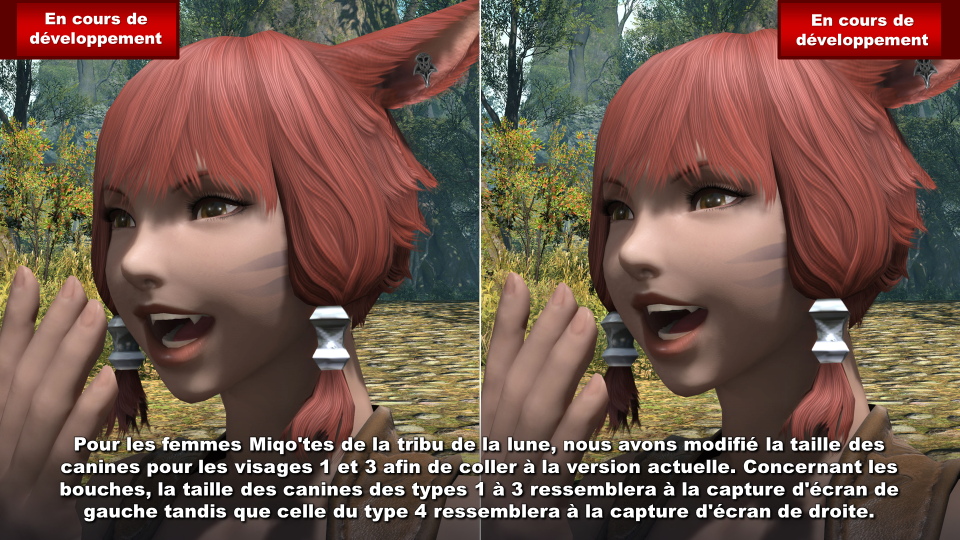 Nous avons reçu des retours selon lesquels les canines, un aspect important des Miqo'tes membres de la tribu de la lune, étaient plus courtes qu'avant. Nous nous efforçons donc de leur donner la même longueur qu'à la mise à jour 6.58, autant pour les hommes que pour les femmes.