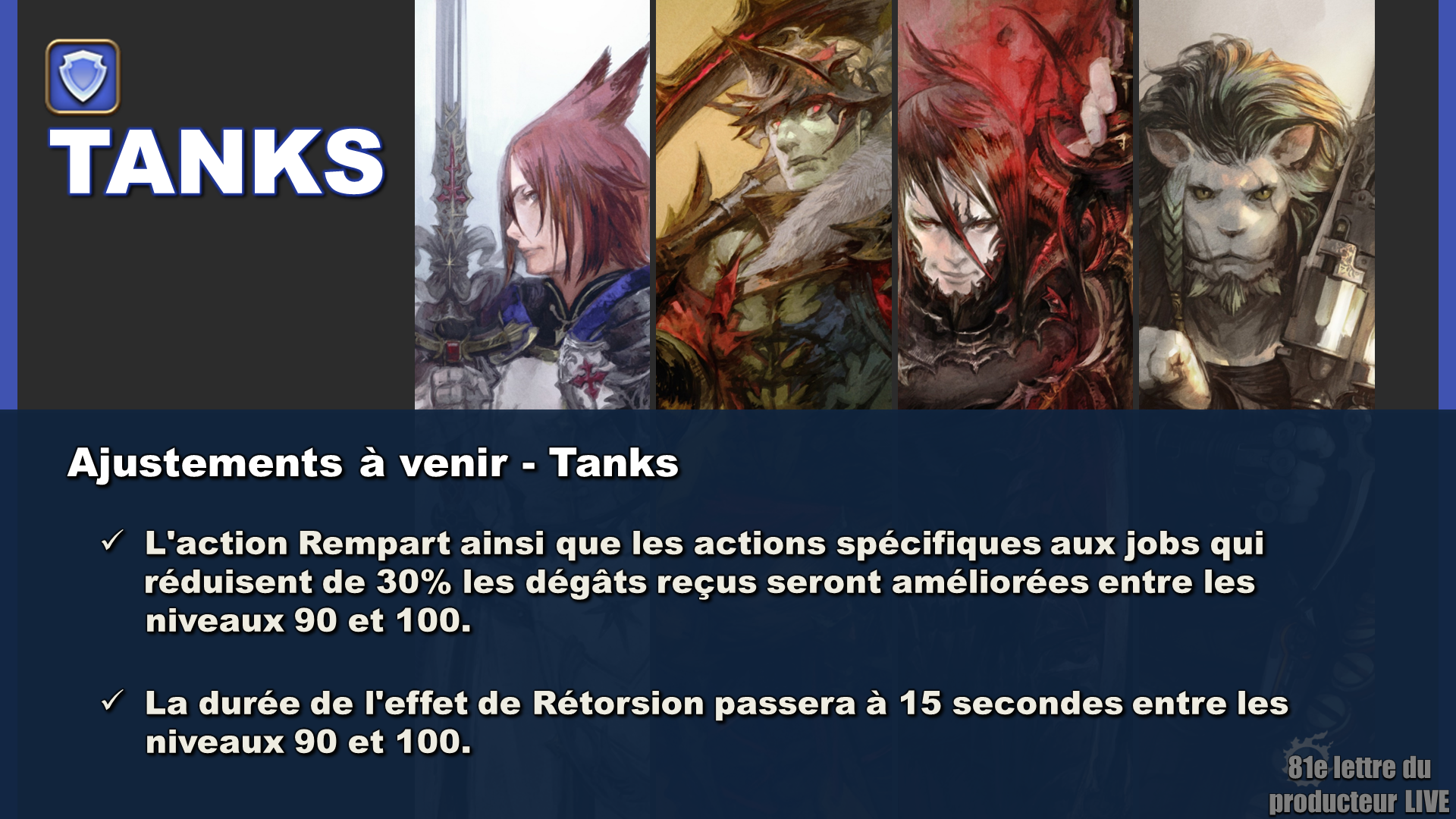 Chaque job de tank bénéficiera d'effets supplémentaires sur leur action spécifique permettant de réduire de 30% les dégâts reçus.