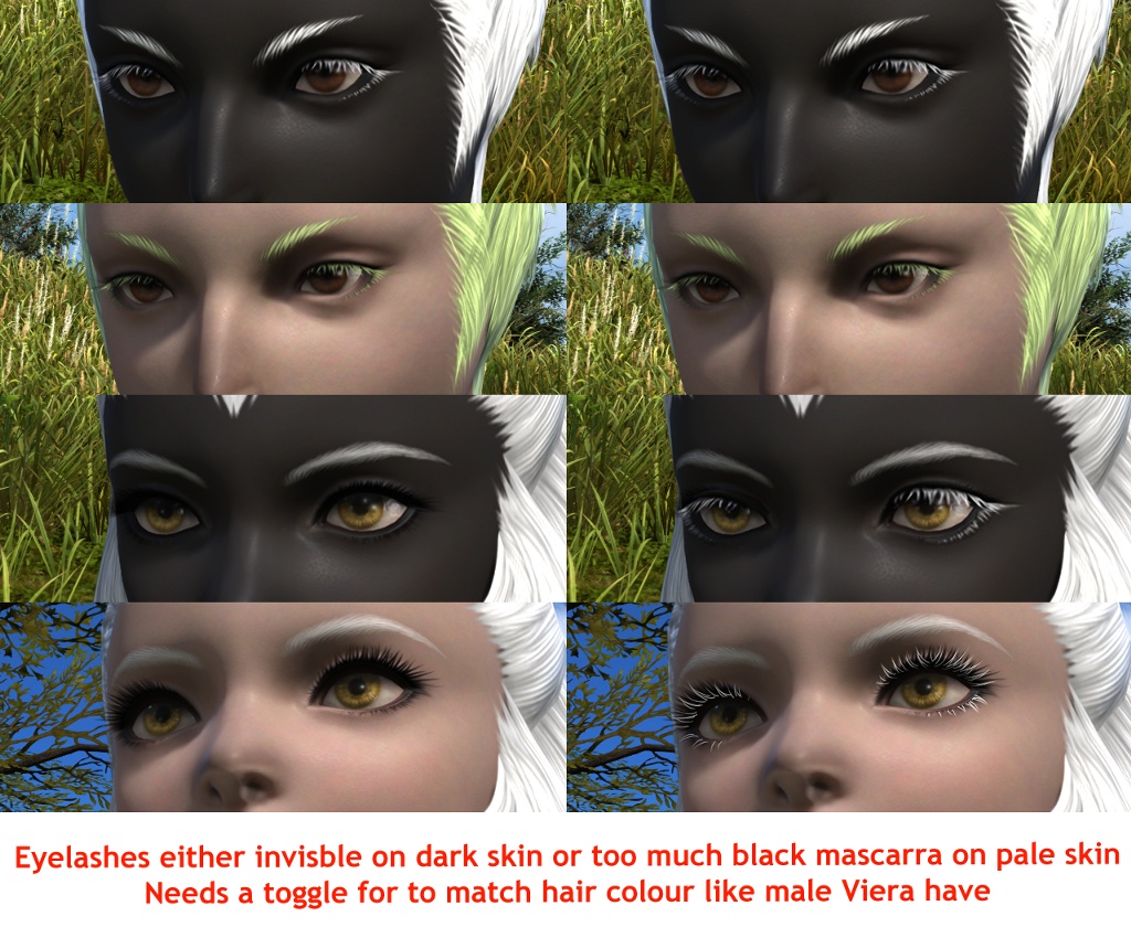 I am aware of the fact that some people complained about the nose shading being "too dark" in benchmark 1 - however, getting rid of it/making it barely visible is not the way to go. I love how Viera are designed as a race and their noses are a unique racial trait - if one wishes to remove that trait, then they are no longer Viera, but simply a Hyur with bunny ears. To me, it's the equivalent of getting rid of the scales on Au'Ra or removing fangs from Miqo'te.