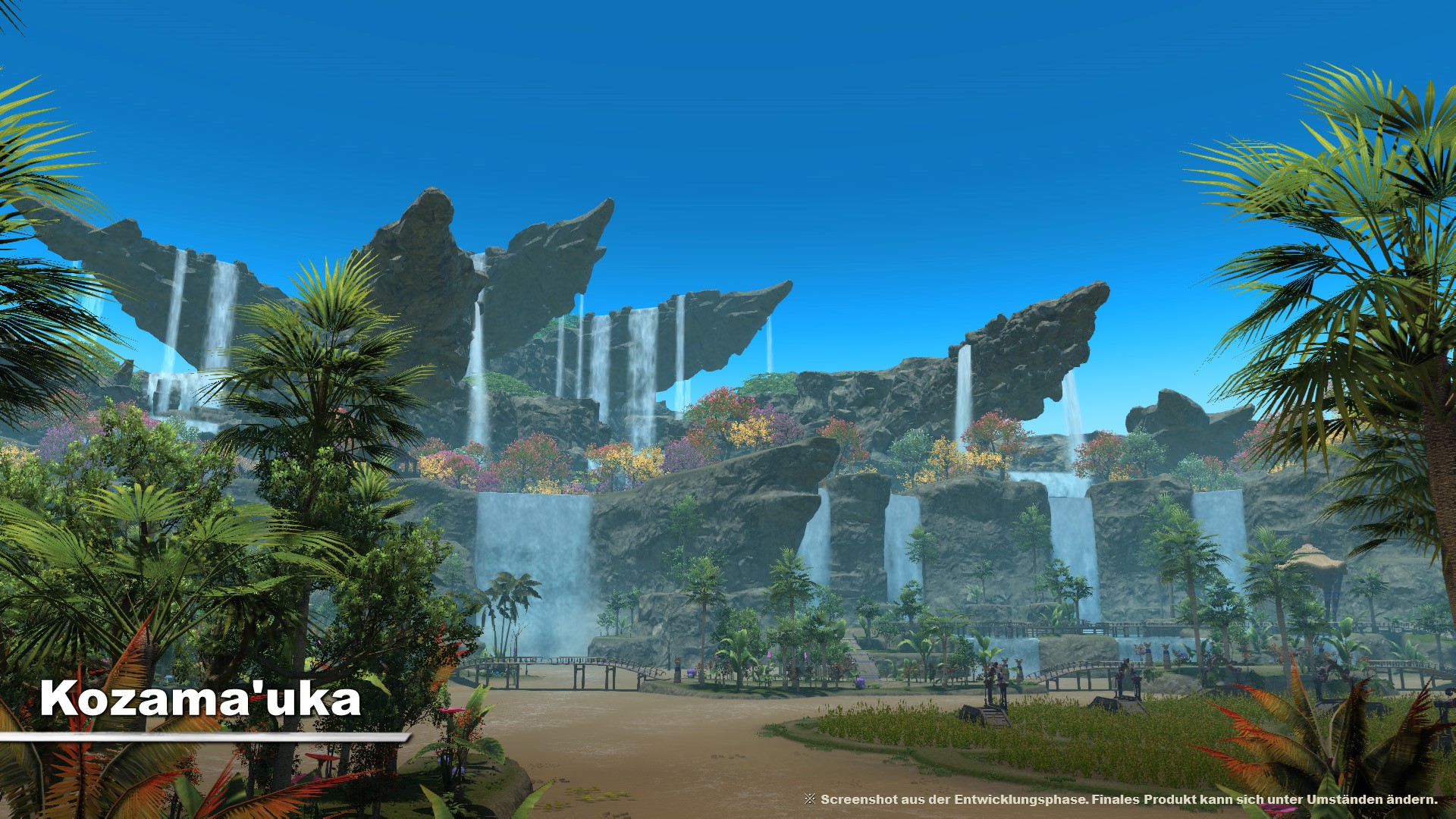Kozama'ukas Aussehen ist von seinem gewaltigen Wasserfall geprägt, der das Gebiet in Hoch- und Tieflande teilt. Der unverkennbare Wasserfall wurde mit viel Hingabe zum Detail gestaltet. So ist zum Beispiel zu erkennen, wie das fallende Wasser beim Kontakt mit dem Boden trüber wird. Der zweite Screenshot scheint auf eine Art Siedlung inmitten all der üppigen Vegetation hinzuweisen.