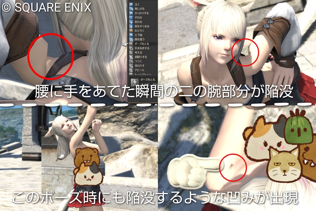 ■発生する症状:ミコッテ女性のエモート「ポーズをとる」を使用した際、一部動作でポリゴンが陥没する。
