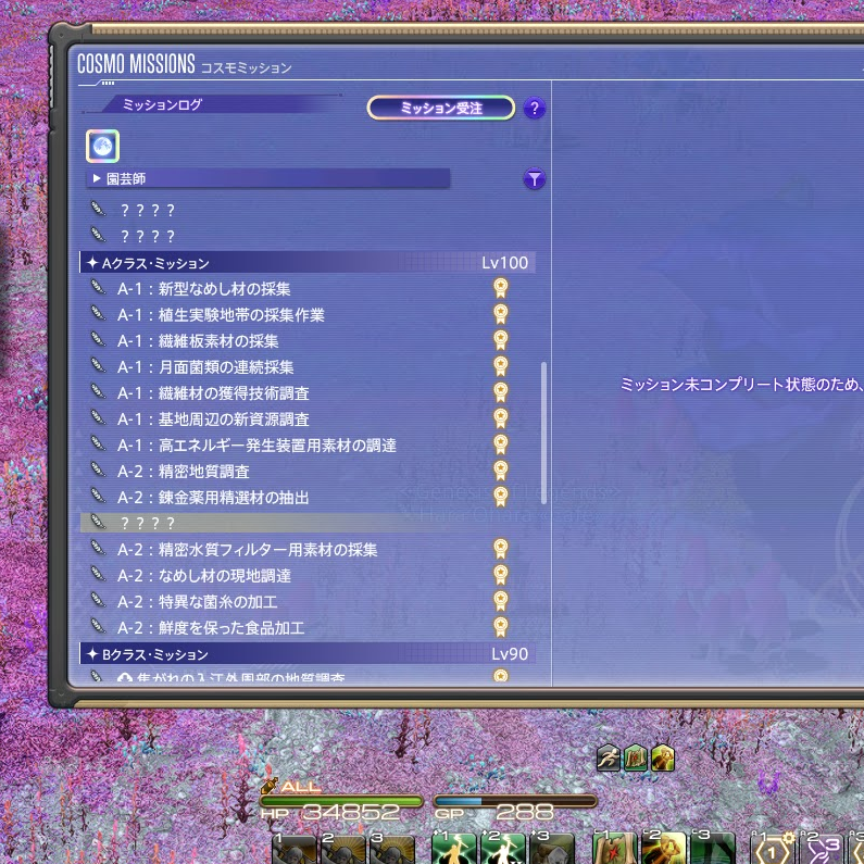 手順:コスモエクスプローラー、園芸師のコスモミッション、ミッションログのAクラスミッションにおいてA-2の上から3つめのクエストが一切出現しない