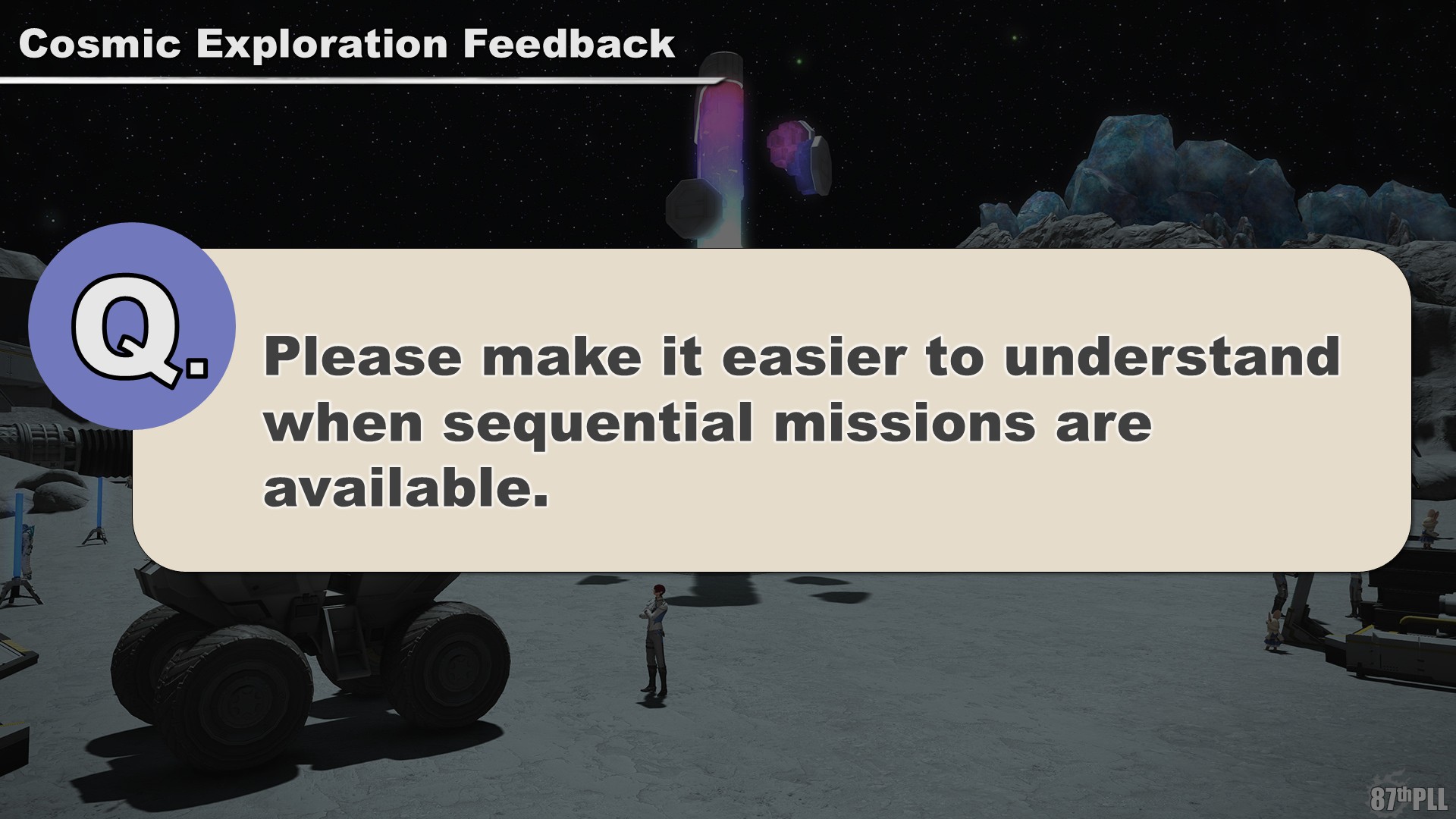 With no summoning bell on the moon, players who wanted to focus on Cosmic Exploration still had to leave the moon to access their retainers. This accessibility issue was compounded as new base camp structures were built, making traveling to, and on, the moon a frustrating experience.