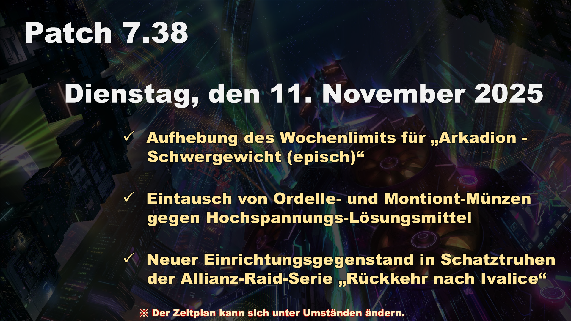 Die Feiertage können für Raidgruppen, die zusammen spielen wollen, ungünstig sein, vor allem aufgrund der Festlichkeiten in Nordamerika und Europa. Wir hatten anfangs die Veröffentlichung der epischen Version während der Feiertage nicht komplett ausgeschlossen, doch angesichts der Tatsache, dass auch unsere verschiedenen Dienstleistenden zu dieser Zeit frei haben, entschieden wir uns für den obigen Zeitplan, mit dem wir im Fall eines Problems vollständig zur Stelle sein können.