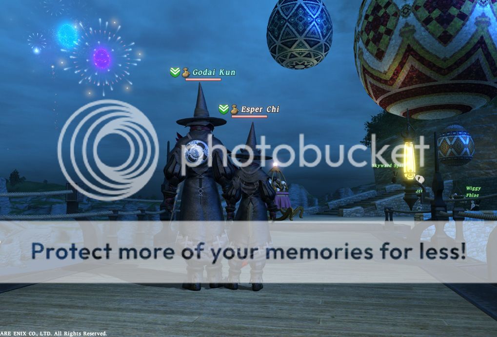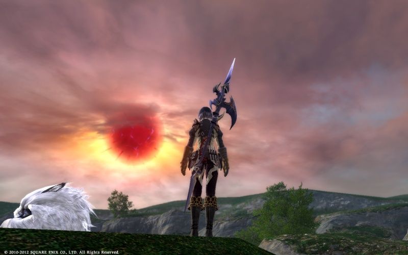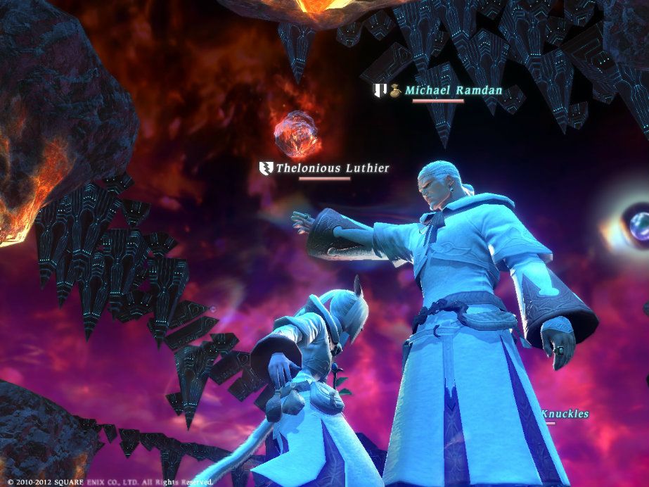 This one was snapped on Friday, July 27, 2012, 9:44:17 PM EST. This was a very exciting day all around in Eorzea as this was the final update with content before 2.0. The previous quest's up to this new quest, the Nael Van Darnus fight, were so well done. The fight it self was epic. Had a blast, really enjoyed the content. This screen shot was the third attempt at the fight and the one where we won. I had to repair my gear from second attempt, and as you can see I forgot to equip my rings and even gloves! Looking upwards in this shot too to help the black mages spot lunar fragments.