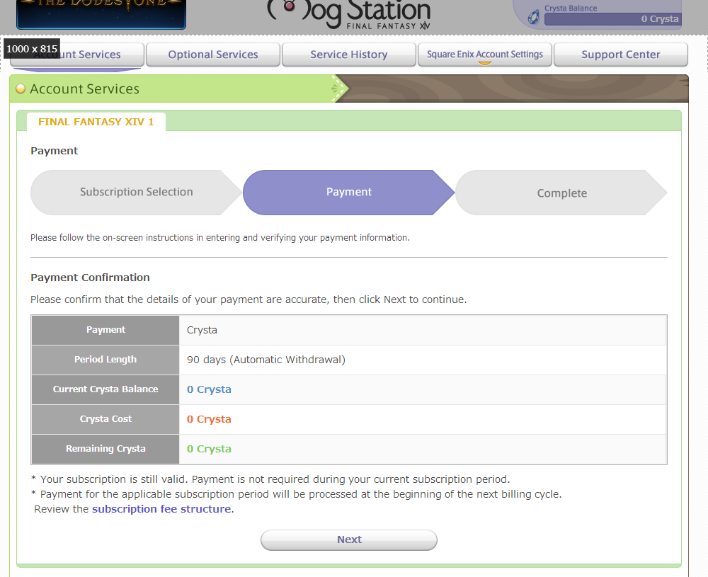 Mog Station -> Account Services -> Subscription Services -> Select Crysta