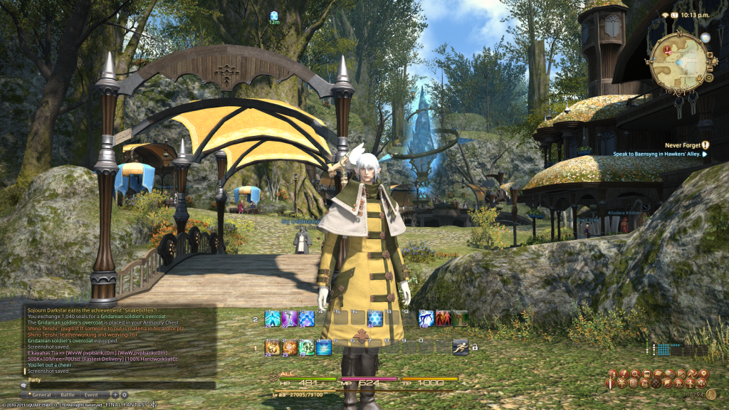 I don't have a screenshot on my chromebook, but my toon is Aeris Rouleaux, currently an Arcanist lvl 21, just joined the Twin Adders...pumped to keep playing and loving the old FF references. (not loving the spammers)
